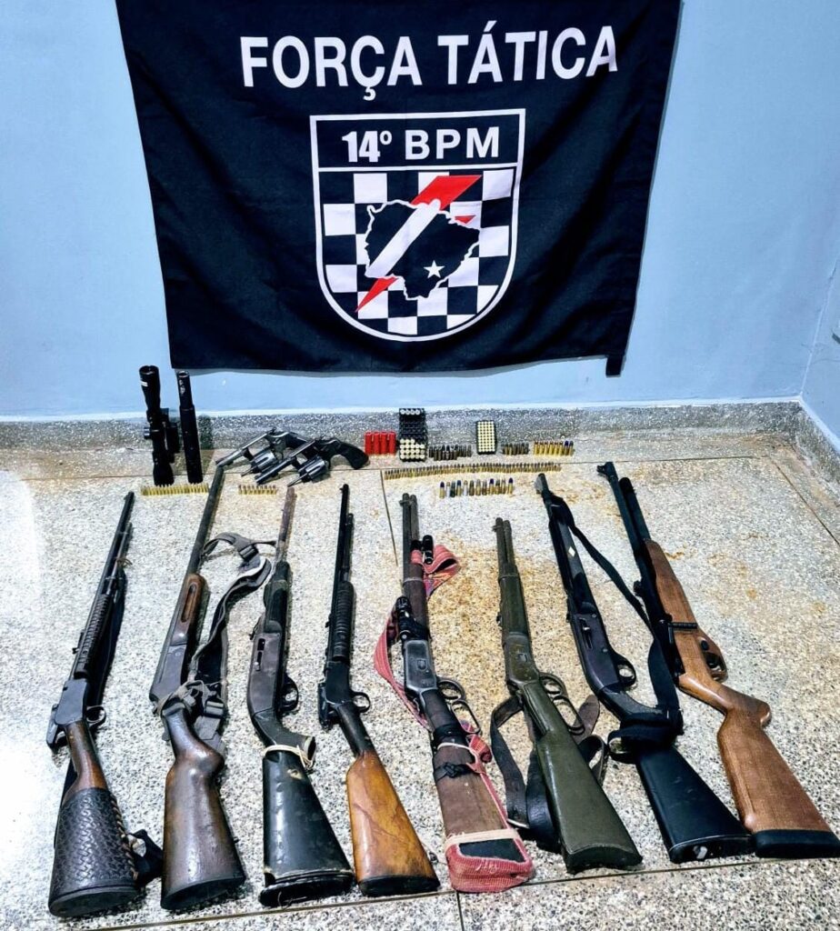 Durante a ocorrência, foram encontradas com os autores um total de dez armas de fogo, sendo elas oito espingardas e dois revólveres calibre .38, além de várias munições intactas.
