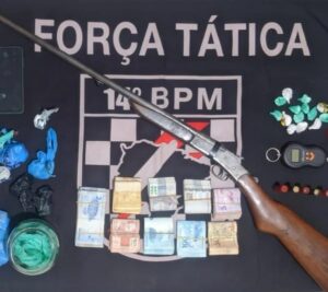 Força Tática do 14º Batalhão prende homem por tráfico, posse irregular de arma, contrabando e receptação no Distrito de Vila União, em Deodápolis.